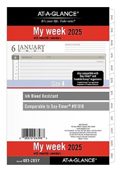 Classically designed, this AT-A-GLANCE planner refill includes a full year of both weekly and monthly planning spreads. Hourly appointment times and ruled daily blocks help organize a busy schedule. Update your planner for 2025 with this planner refill. Weekly and monthly planner refill covers a 12-month range from January 2025 to December 2025 with Julian dates. Dimensions: 8. 5" x 5. 5". Comes in white with brown shading. One week per two pages has half-hourly appointment times from 7:00 a. m. to 7:30 p. m., Monday to Friday, while weekends are condensed with 7:00 a. m., 12:00 p. m., and 6:00 p. m. ticks; one month per two pages features ruled daily blocks for detailed planning and a column for notes. High-quality paper ensures ink bleed resistance. Tabbed for quick access to the desired month. Desk size 4 pages are pre-punched for use in a seven-ring planner (sold separately).