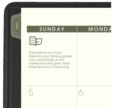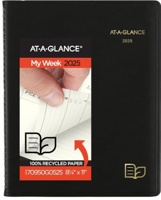 Stay on track with this AT-A-GLANCE Recycled weekly and monthly planner, partially made from recycled materials. The planner includes quarter-hourly appointment times for detailed scheduling. Plus, tips for green living are featured on every page. Weekly and monthly planner covers 12 months from January 2025 to December 2025 with Julian dates. Guaranteed to last all year. Made with 100% postconsumer waste recycled paper and 50% postconsumer waste recycled covers. One week per two-page spread has ruled columns with quarter-hourly appointment times from 7:00 a. m. to 8:45 p. m., Monday to Friday; Saturday times run from 7:00 a. m. to 5:30 p. m., and Sundays are untimed for flexibility; one month per two-page spread features unruled daily blocks and past, current, and future month reference calendars. Find tips for green living on every page. Comes in a classic black design. Features a faux leather cover. Twin-wire binding helps prevent snags and secure the pages. Special pages include future planning, important dates, telephone/address, and notes pages. Each month is tabbed for easy navigation. Thoughtfully designed and assembled in the US using high-quality materials. Page dimensions: 8. 25" x 11".