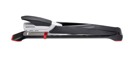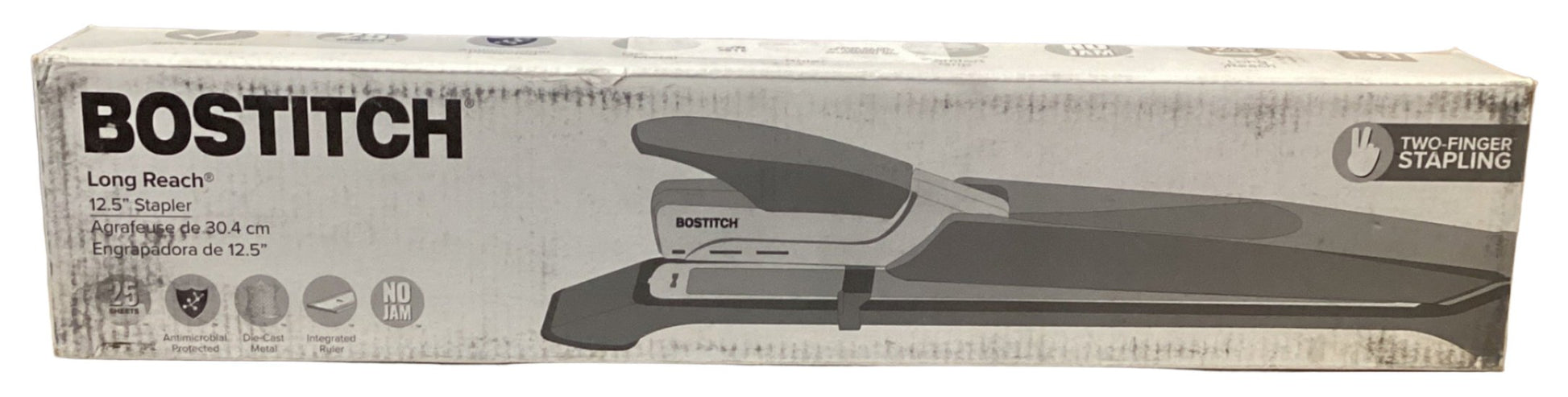 The Bostitch Long Reach Stapler (ACI1610) combines efficiency and precision for all your stapling needs. Featuring One-Finger technology, this stapler makes the task 80% easier, allowing you to staple up to 25 sheets with just a push of a finger. Its 12 1/2" long reach is perfect for binding larger projects, such as booklets and pamphlets, with the ability to staple up to 25" wide. Designed for professional-grade results, it includes an integrated ruler and sliding guide for accurate alignment. The durable metal housing ensures lasting performance, while the non-slip base provides stability and protects your desk. This stapler delivers smooth, jam-free operation, making it an excellent choice for both office and creative projects.