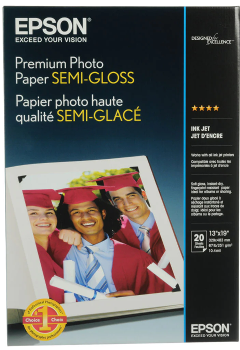 Epson Premium Semigloss Photo Paper 13x19 (20) is a fantastic media with the look and feel of true photographic paper. With a semigloss finish, Epson Premium Semigloss Photo Paper is the perfect paper for printing displays or scenic color images with stunning results.