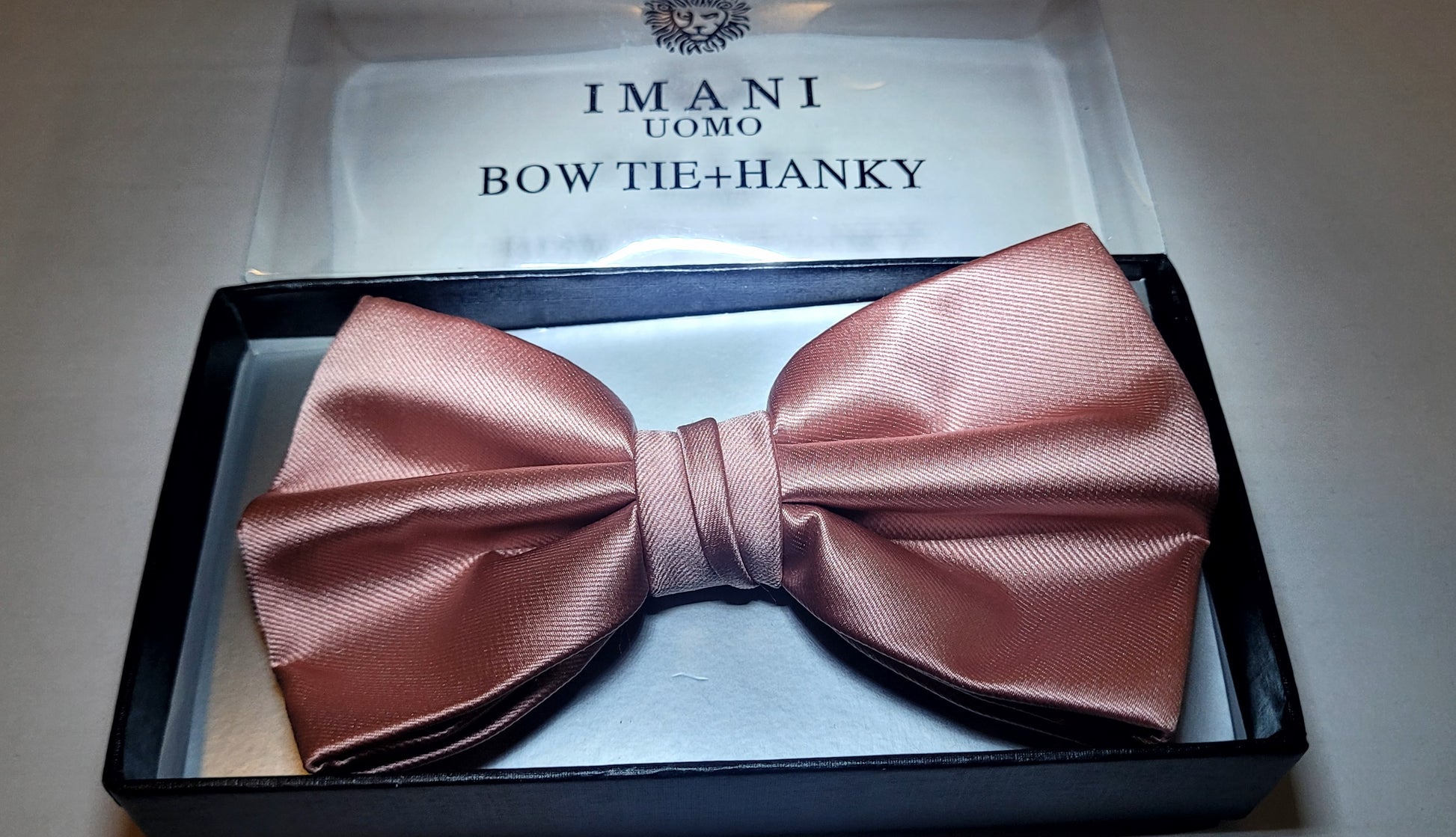 The Imani Uomo Pre-Tied Bow Tie + Hanky in rose pink microfiber offers a stylish and convenient accessory set, perfect for formal occasions. Its pre-tied design ensures ease of use, while the microfiber material provides a sleek appearance.