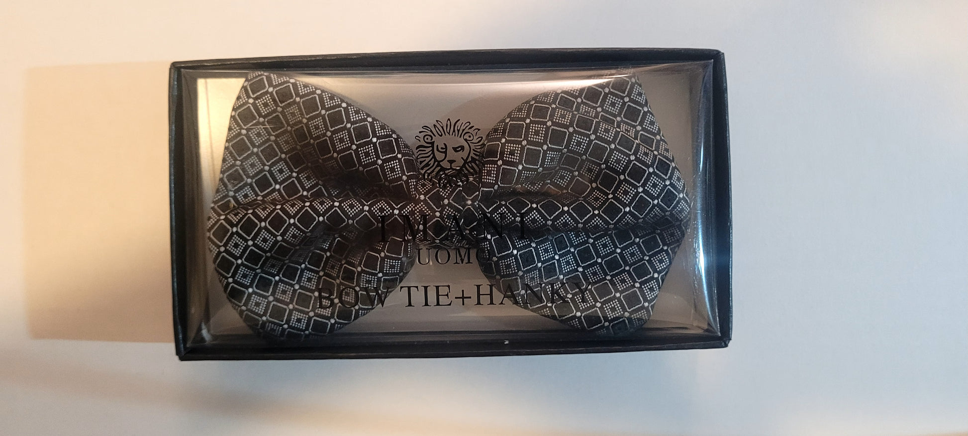 The Imani Uomo Pre-Tied Microfiber Bow Tie in Black & White Geometric Print offers a stylish and convenient accessory for formal occasions. Its pre-tied design ensures ease of use, while the microfiber material provides a sleek appearance suitable for various events.