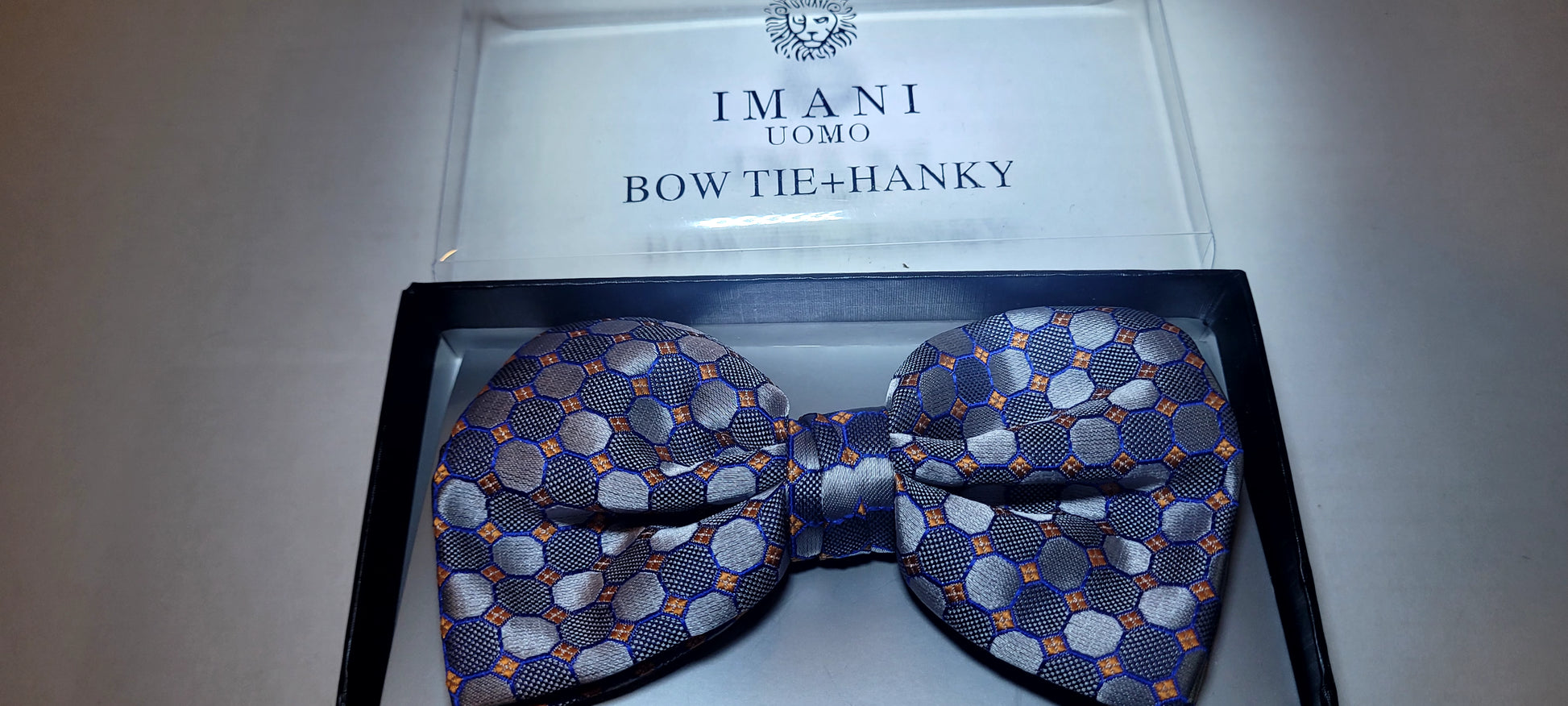 The Imani Uomo Pre-Tied Microfiber Bow Tie + Hanky, Dark and Light Blue with Orange diamond geometric pattern offers a stylish and convenient accessory for formal occasions. Its pre-tied design ensures ease of use, while the microfiber material provides a sleek appearance suitable for various events.