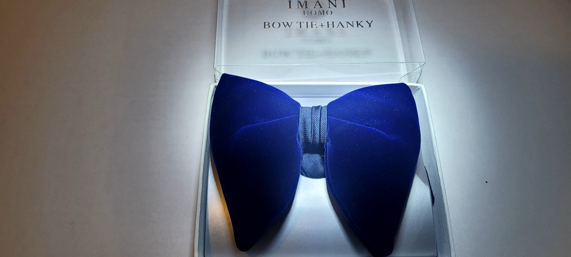 The Imani Uomo Velvet Pre-Tied Bow Tie + Hanky in dark blue microfiber velvet offers a stylish and convenient accessory set, perfect for formal occasions. Its pre-tied design ensures ease of use, while the microfiber material provides a sleek appearance.