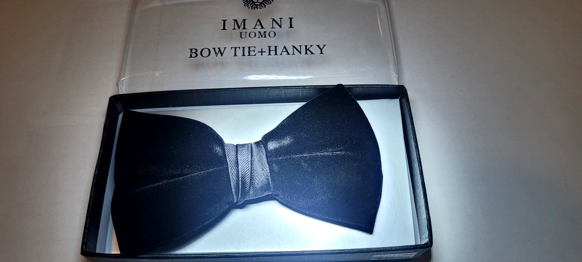 The Imani Uomo Velvet Pre-Tied Bow Tie + Hanky in black microfiber velvet offers a stylish and convenient accessory set, perfect for formal occasions. Its pre-tied design ensures ease of use, while the microfiber material provides a sleek appearance.