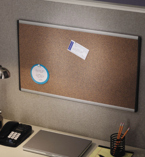 Bulletin Board, Board Material Cork/Fiberboard, Board Color Tan, Board Frame Material Aluminum, Width 30 in, Height 18 in, Frame Color Silver, For Use Cubicles, Includes Mounting System and Self-Healing Surface.