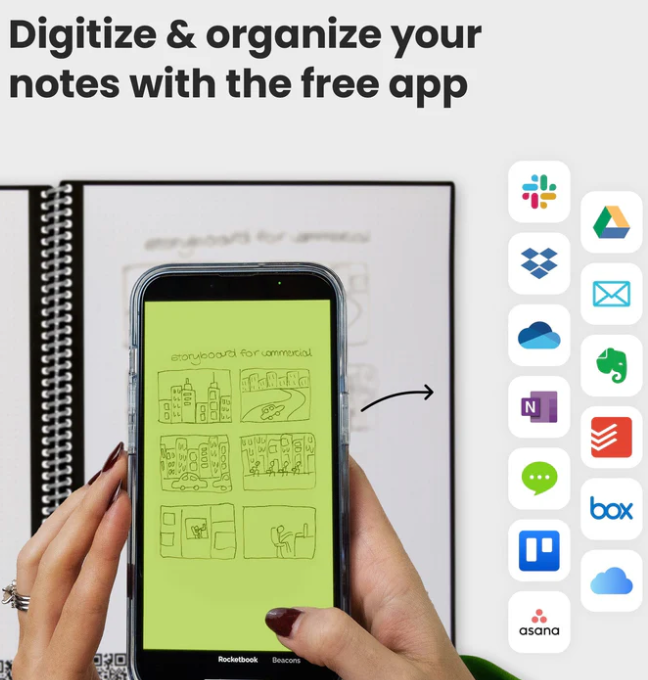 - Smart Technology: Use the Rocketbook app to scan your notes and instantly upload them to cloud services like Google Drive, Dropbox, Evernote, and more.