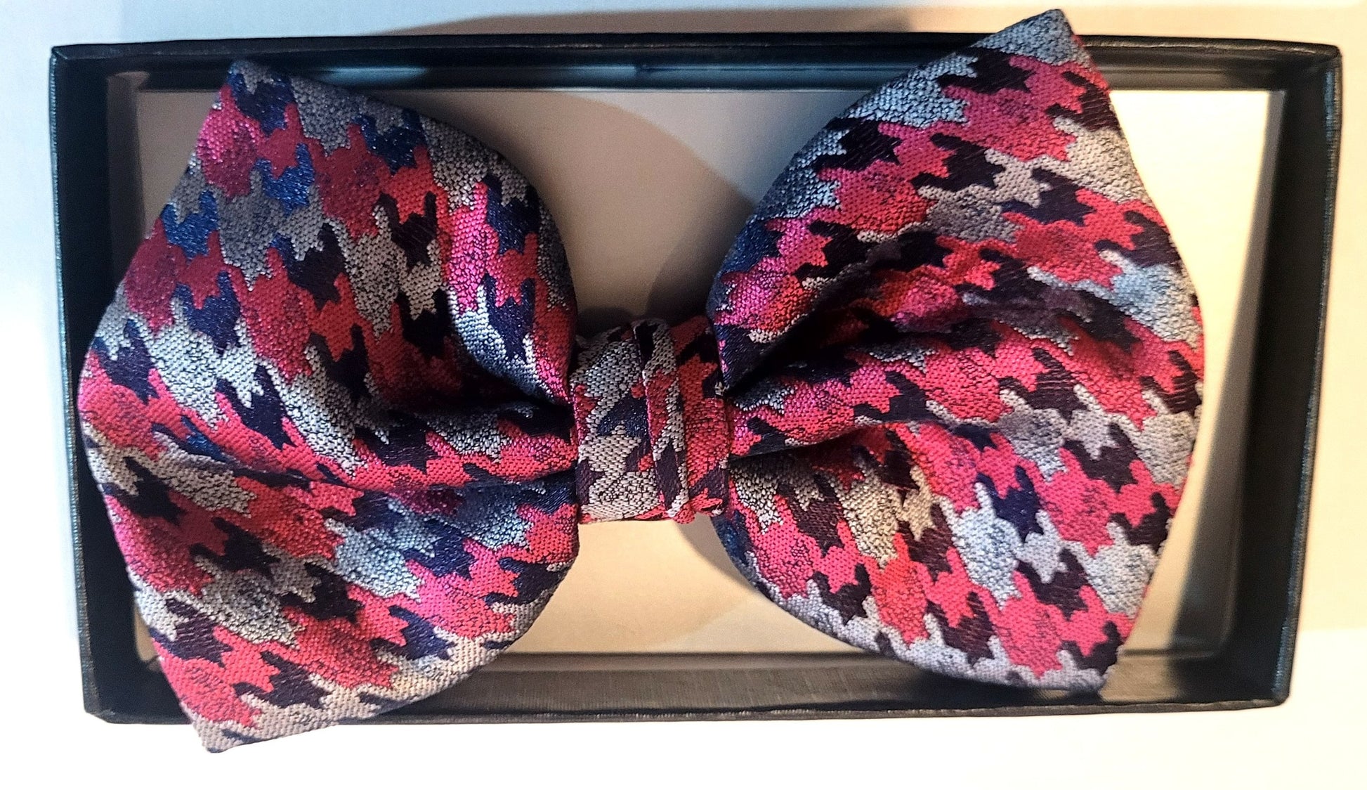 A Rose Pink, Black, and Silver Checkered Pattern Pre-tied Microfiber Bow Tie is a bold and elegant accessory that blends contemporary style with a touch of flair. Here’s a detailed breakdown for styling or product description purposes: