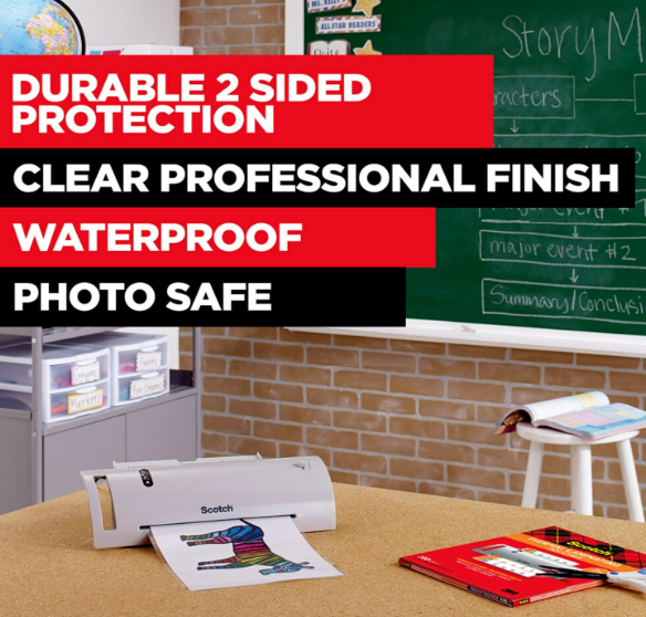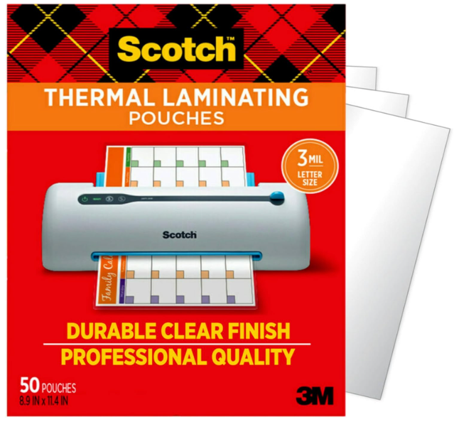 Scotch Laminating Pouches, 3 Mil, 9" X 11.5", Gloss Clear, 50/pack ( MMMTP385450 ) | Protect and preserve documents you handle frequently. Scotch pouches are clear to let important information show through and moisture resistant to protect documents, pictures, cards and more. Compatible with all thermal laminators.