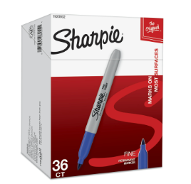 The Sharpie Fine Tip Permanent Marker Value Pack (36 markers, Blue) features bold, quick-drying ink that resists water and fading. Perfect for creating lasting, vibrant marks on almost any surface, Sharpie markers are known for their durability and iconic quality. With a fine bullet tip, they allow for precise, bold lines, making them ideal for self-expression and creative projects. This general-use, non-toxic marker pack is perfect for stocking up and saving.