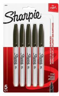 Sharpie Fine Tip Permanent Markers, Black, 5-Pack – These versatile markers feature a fine tip for precise lines and bold, permanent ink that dries quickly and resists fading and water. Ideal for writing, labeling, and drawing on various surfaces, including paper, plastic, metal, and wood. The sleek design ensures comfortable use for everyday tasks.