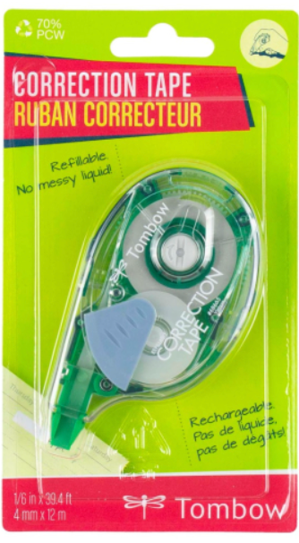 Tombow Mono Refillable Correction Tape, 1/6" X 472" ( TOM68665 ) | MONO Correction Tape is the original single-line correction tape packaged in a convenient refillable applicator. The compact, easy-to-use side-action applicator simplifies accurate application to instantly correct typed or handwritten documents. Dual Gear technology features a self-tightening mechanism which prevents tape looping and pulling. Make instant corrections with no drying time no mess and no waiting! The ergonomic design with rubber grip allows you to comfortably make corrections throughout the work day. Easily adjust break-proof tape with the rewind knob. Premium-quality tape allows you to re-write with pen, pencil or marker. Easily refill with snap in cartridges. Refill cartridges available in four vibrant colors.