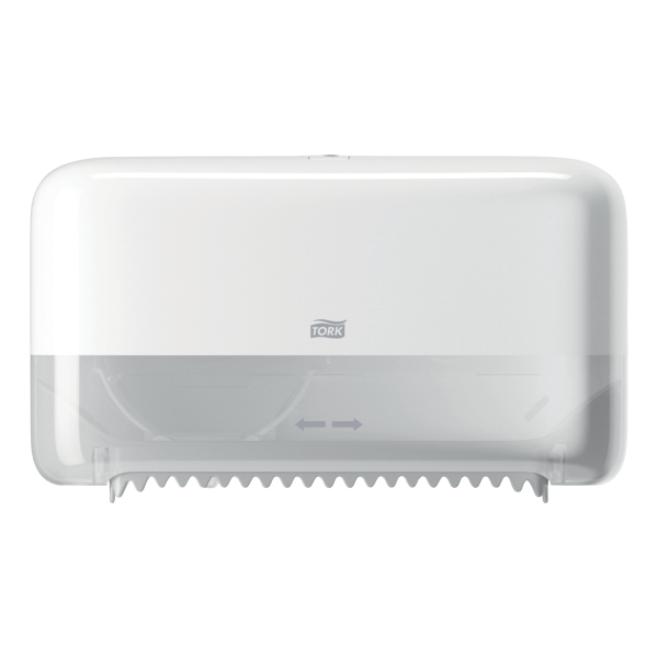 Tork Twin Toilet Paper Roll Dispenser T7: Frequent commercial toilet paper run-outs can be a problem in small high-traffic restrooms. Keep your customers happy while saving your staff time and effort with our compact high-capacity coreless bath tissue dispenser. Fill it with our Tork® toilet paper which holds twice as much bath tissue than conventional toilet paper rolls. The convenient see-through window will easily indicate when it s time to refill and because these bath tissue rolls are coreless there s less trash to dispose of. Advantages at a glance: + Improve hygiene with closed dispenser + Space-saving compact design + See-through window for easy refill checks + Primary roll is nearly consumed before second roll transfers.