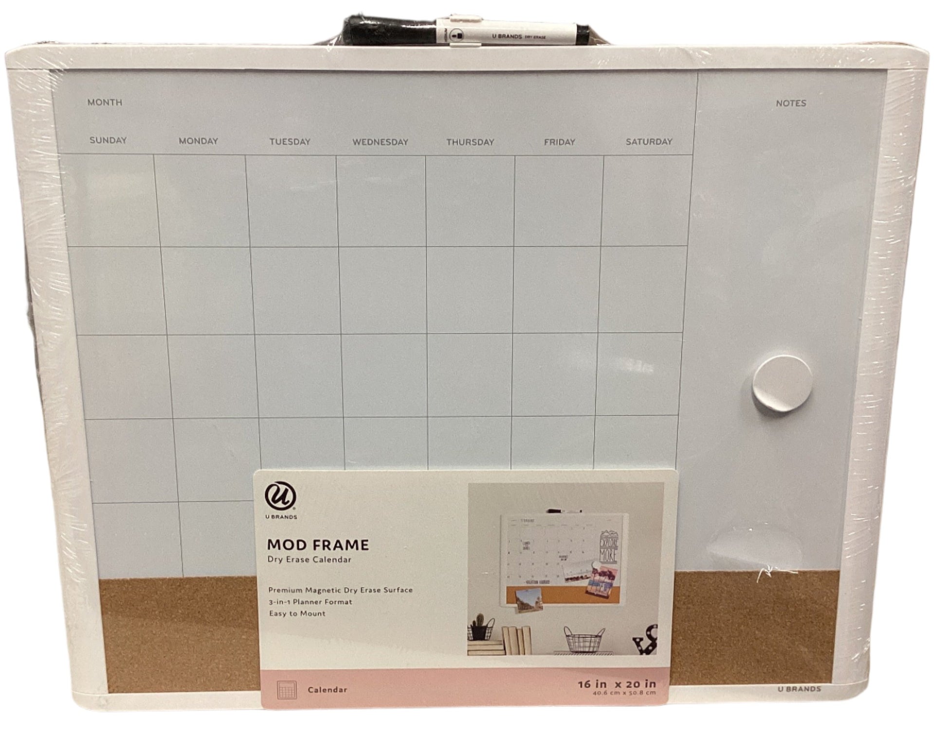 The month ahead never looked so good! This 16” x 20” Mod Frame 3-in-1 Dry Erase Planner from U Brands® provides everything needed to stay on top of that busy life. The premium steel dry erase surface is framed in an updated plastic profile for a durable and modern look. Fill in the month's activities, events, and notes that simply cannot be forgotten. The dedicated notes section is perfect for any overflow, and you can use any push pin on the natural cork bulletin strip to tack up important reminders, tickets, photos or whatever it may be to set up for a successful month. The included dry erase marker features a built-in eraser for quick convenient erasing, and the stain resistant dry erase surface allows for frequent use month after month.