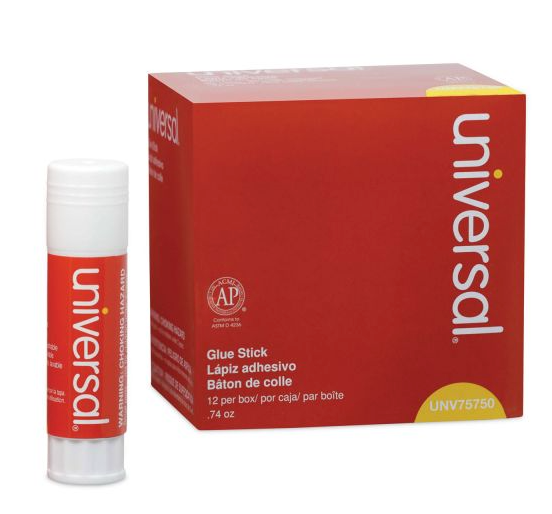 Universal Glue Stick, 0.74 Oz, Applies And Dries Clear, 12/pack ( UNV75750 ) | Universal Glue Stick is a washable and acid-free glue that comes in a convenient and easy-to-use stick. Great for use on paper, cardboard, photos, and fabric. The solid glue dries clear and wrinkle-free, making it ideal for archival materials. Great for use in schools, day cares, and craft projects.